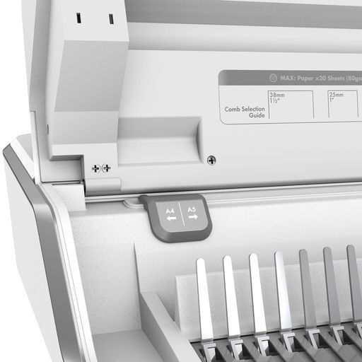 Fellowes har skapat en unik 3-i-1-maskin designad för moderna arbetsplatser. Kombinerad bindnings-, häft- och hålslagningsmaskin. ’Perfect Align-systemet’ guidar användaren till den optimala storleken på tillbehöret så att resultatet blir bästa möjliga. Maskinen kan binda upp till 300 ark med en maximal kamstorlek på 38 cm. Hålslagaren klarar upp till 30 ark och det går att välja mellan 2 eller 4 hål.