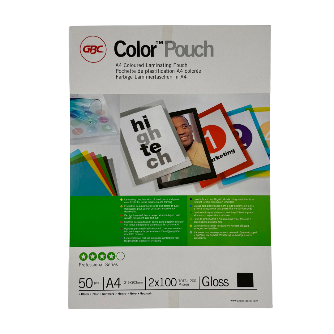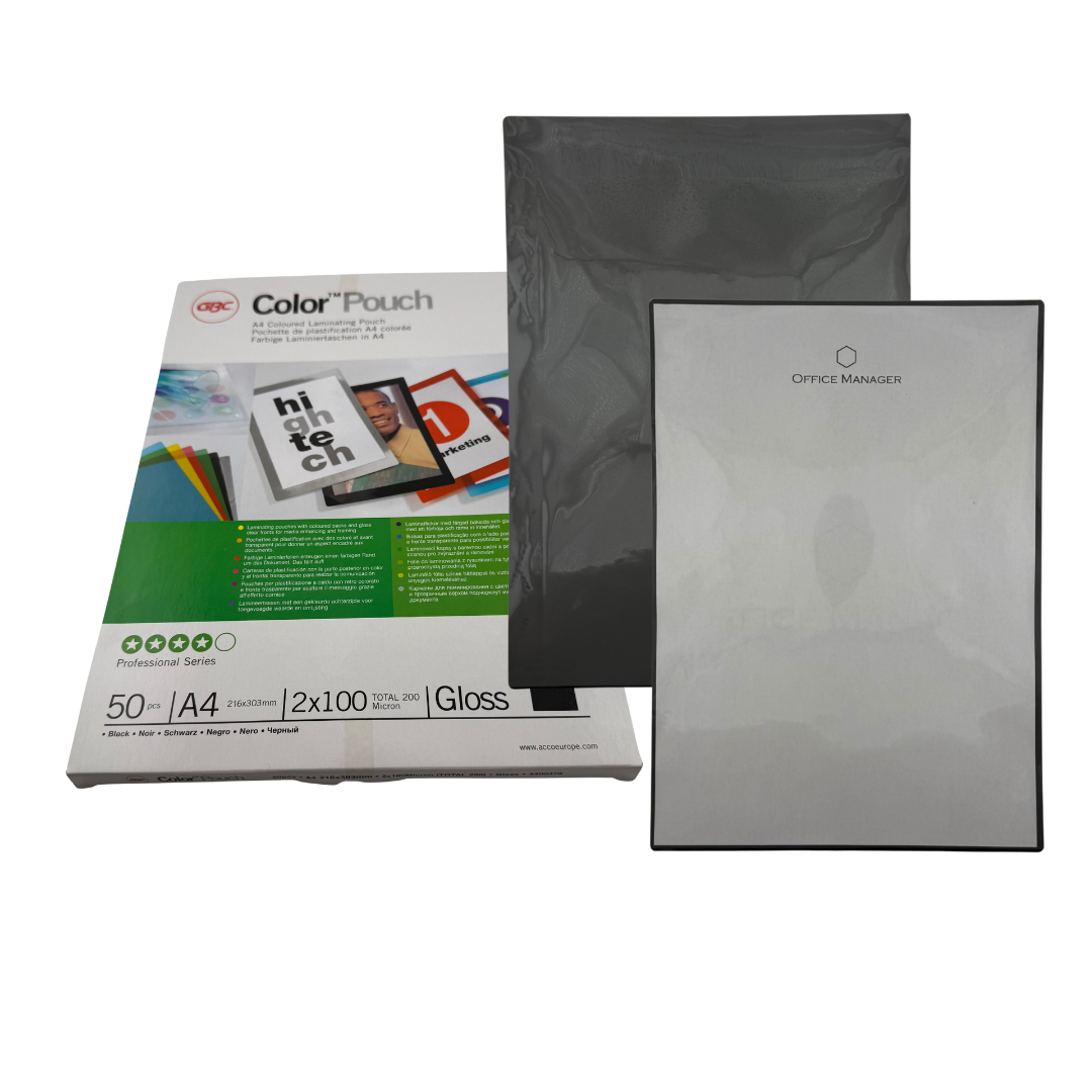 Lamineringsficka med färgad baksida och glasklar framsida för att förhöja och rama in innehållet. Finns i svart, silver. röd, blå och gul. 50 st/fp
