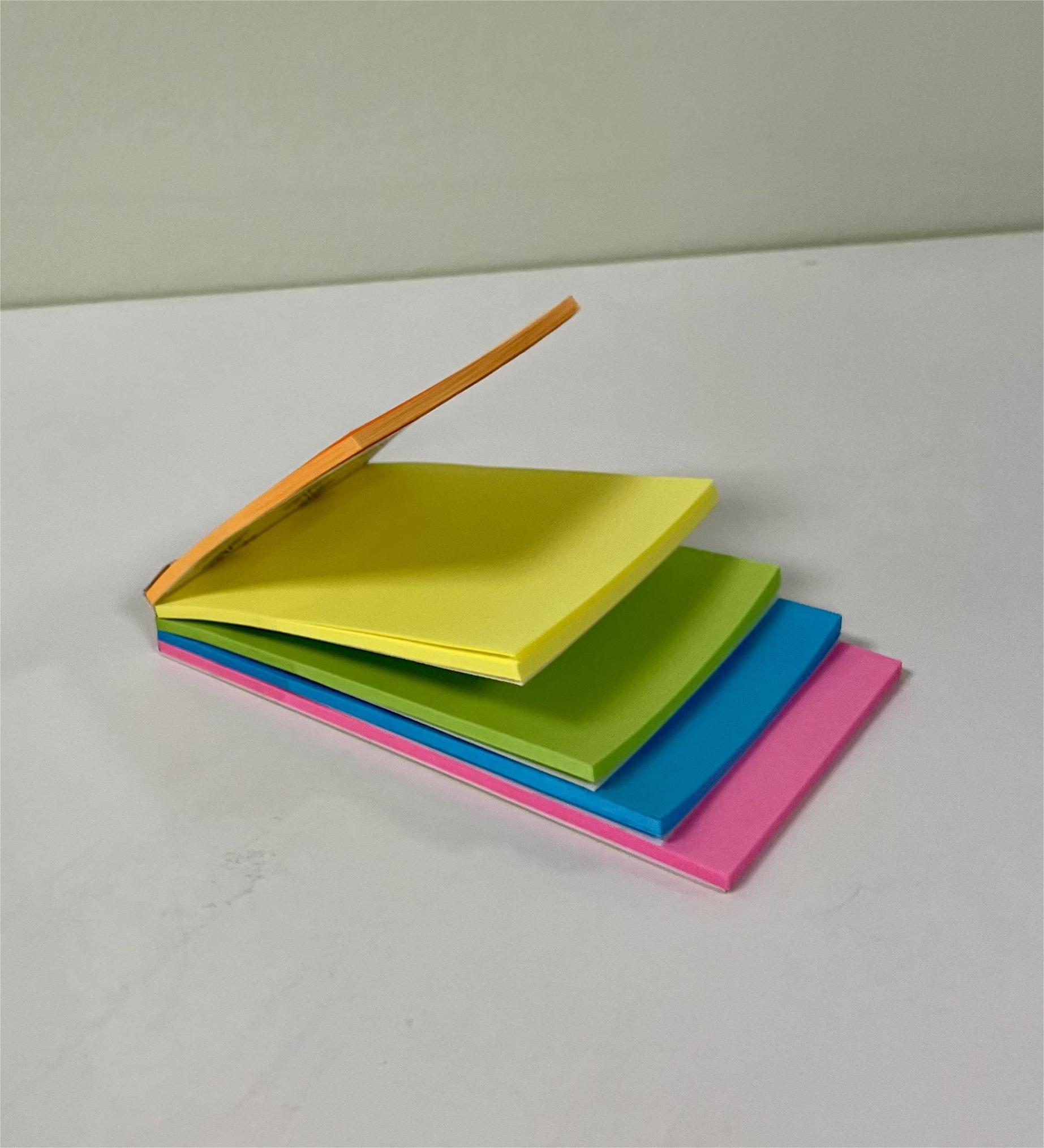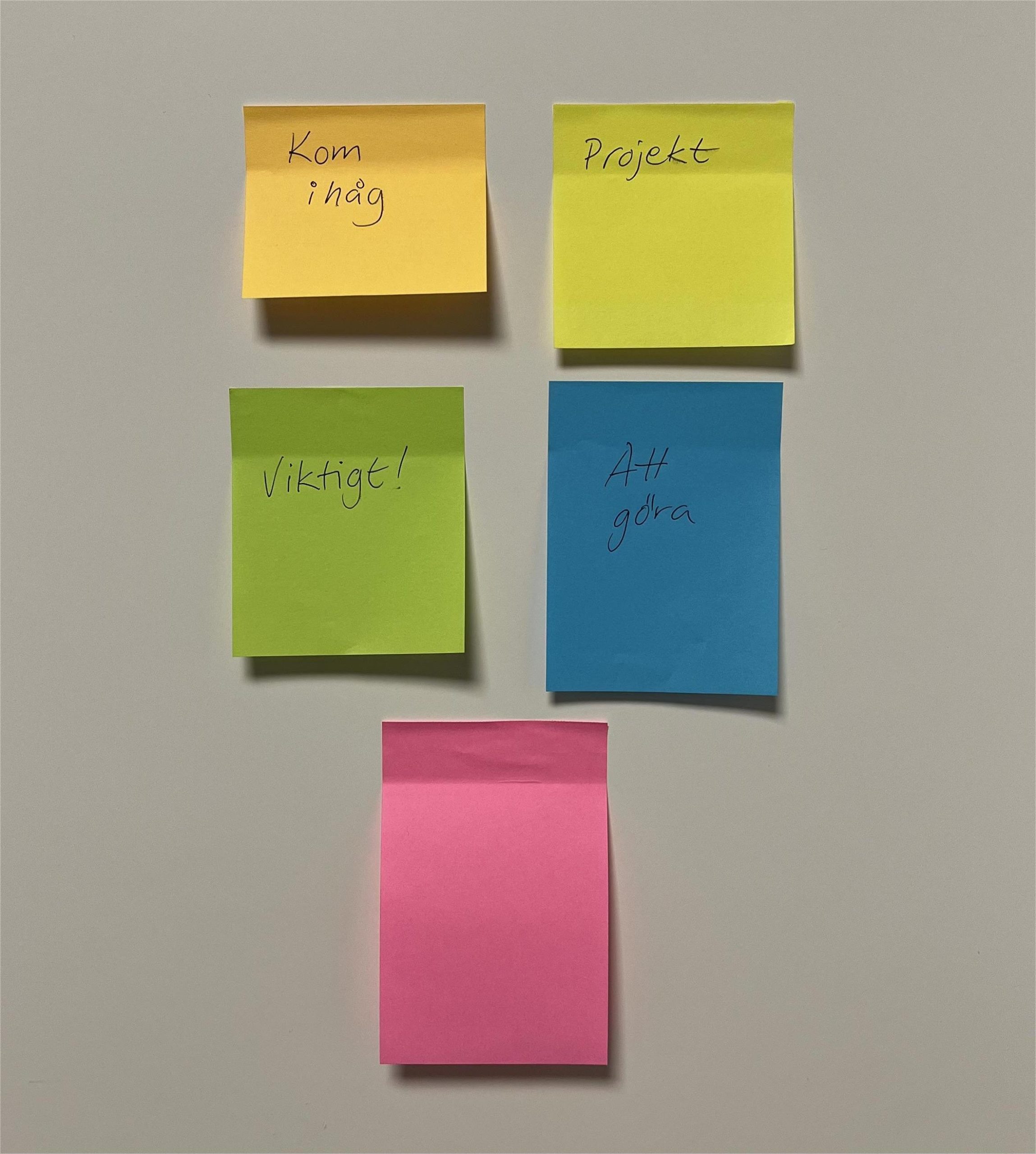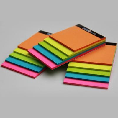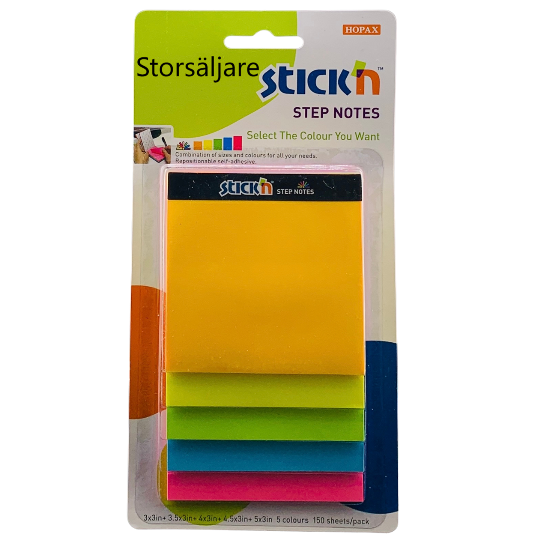 Självhäftande kom-ihåg-lappar som fäster överallt om och om igen utan att skada underlaget. 5 färger; grönt, gult, orange, blått och rosa i olika storlekar som ligger som en trappa. 150 ark. Perfekt för skrivbordet och mötesrummet.